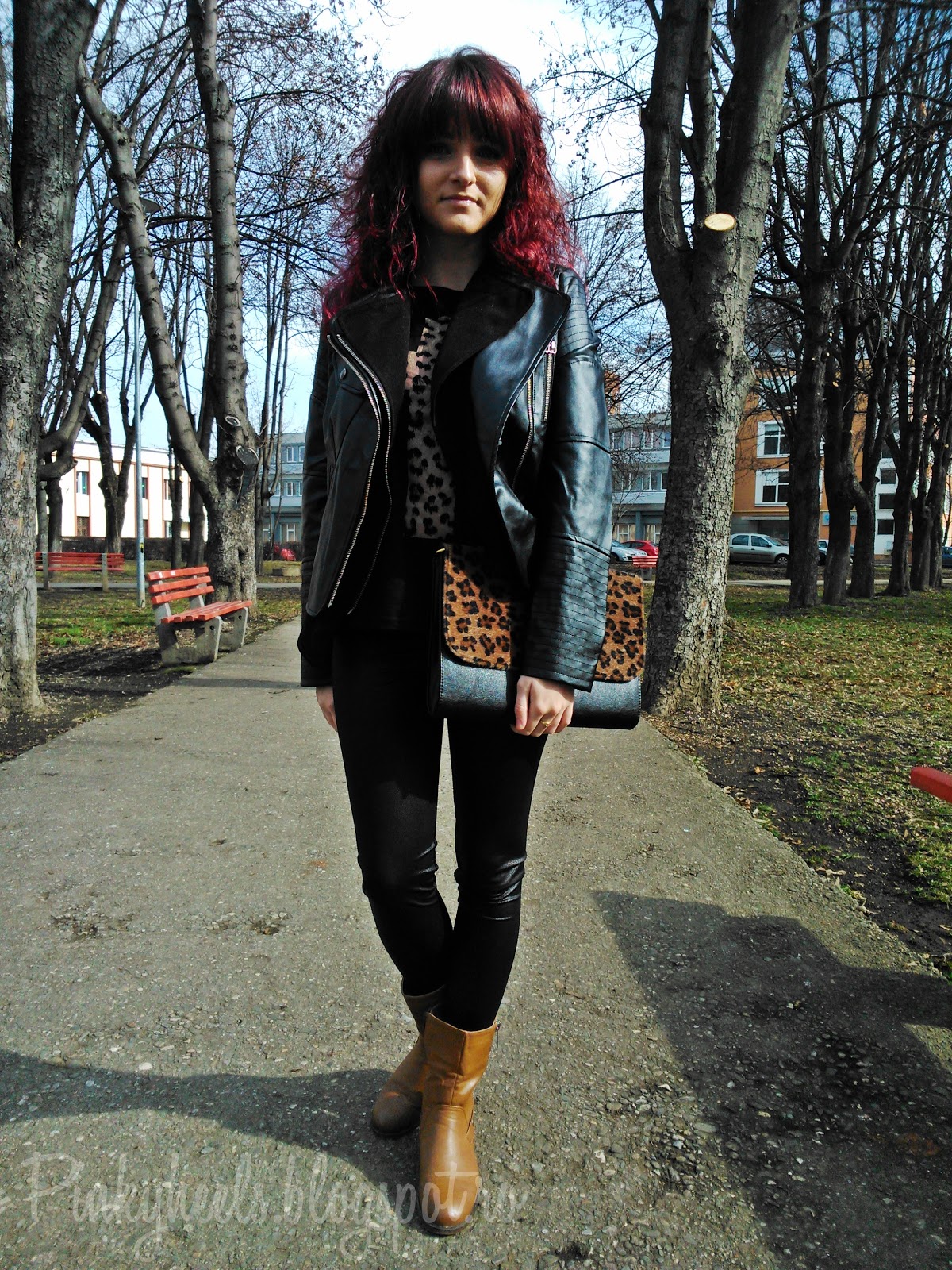 De exemplu tipa din imagine poarta in partea de sus o geaca neagra si un tricou (la culoare) cu animal print. Arata foarte bine. In partea de jos, iti poti lua niste blugi deschisi, sa nu dai tenta prea mare de negru. Uite niste exemple dragute de blugi : http://images1.chictopia.com/......88_400.jpg